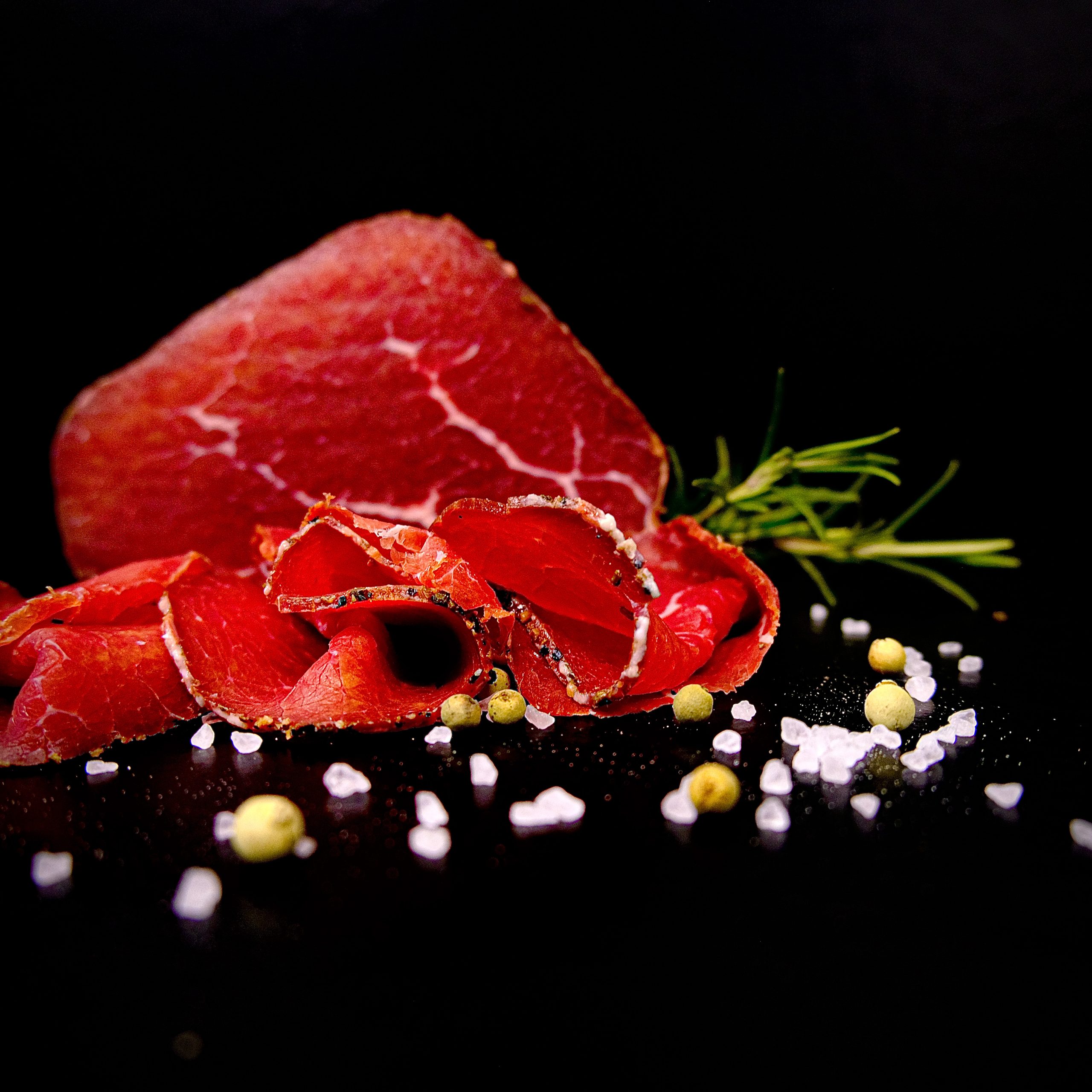 Unser Rinderschinken ist sehr zart und mager. Er wird ausschließlich aus der Semerrolle hergestellt und ist mit erlesenen Kräutern verfeinert. Abgerundet wird der Geschmack mit einer leichten Rauchnote. Probieren Sie selbst!